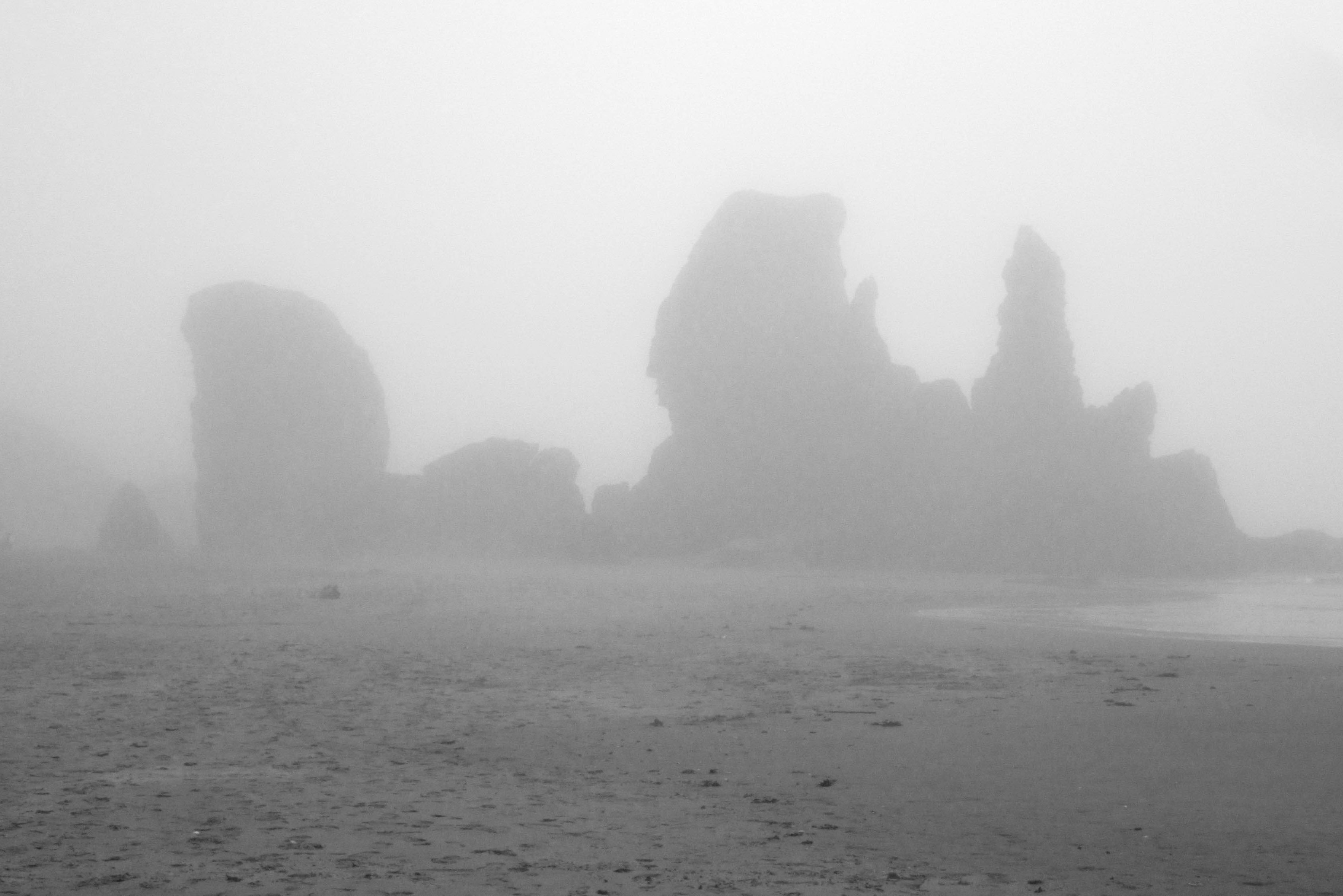 My desire to wander was stronger than my desire to stay out of the cold, wet fog. I put on my rain coat and started walking the black sand. I could hear the ocean waves colliding on shore, but could see nothing. As I walked towards the sound, outlines of rocks came into view. Their odd contours were made more mysterious by the color-consuming fog that let only black and white through. I approached these outlines, one after another, and watched as their details came slowly into view like an idea realized or an emotion raptured. I found myself walking miles of beach to see what this outlines was, and the next, and the next. It was like chasing mysterious phantoms, their existence known only from a distance by their very faint appearance.
